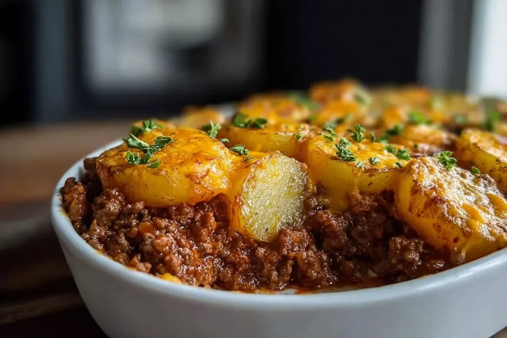 Next, layer the parboiled potatoes and seasoned beef in a baking dish. For that gooey, melty texture, incorporate a generous amount of shredded cheese during assembly. Bake the dish in a preheated oven until the cheese bubbles and turns golden—this usually takes around 20-25 minutes.