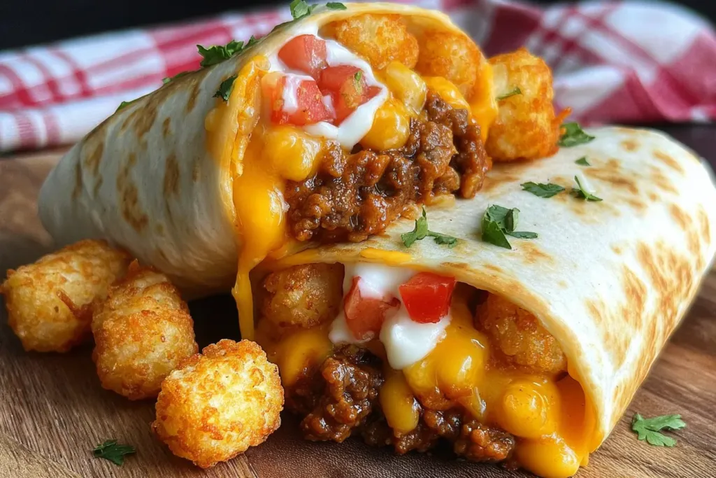 These Cheesy Potato Burritos with Crispy Tater Tots are a delicious fusion of comfort food and Tex-Mex flavors, perfect for a quick and satisfying meal.