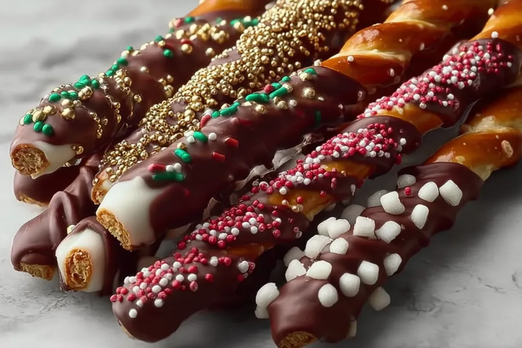 These Holiday Chocolate-Dipped Pretzel Rods are the perfect festive treat, combining crunchy pretzels with sweet chocolate and fun decorations.
